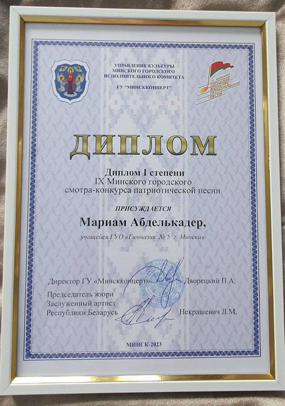 Поздравляем Мариам Абделькадер с дипломом 1 степени IX Минского городского смотра-конкурса патриотической песни.