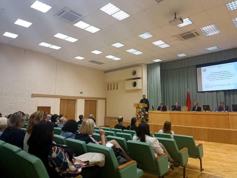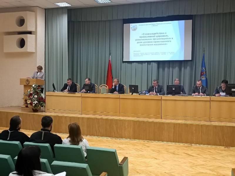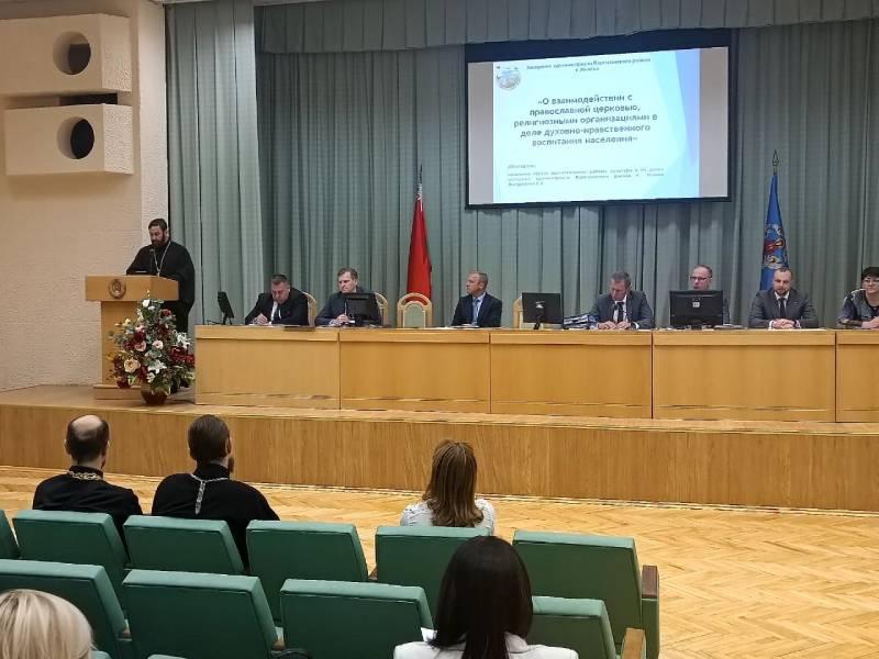 На заседание были приглашены настоятели храмов, руководители иных религиозных организаций, зарегистрированных на территории Партизанского района г.Минска, руководители и заместители руководителей учреждений образования, общественных организаций, иные заинтересованные. Глава района Вороницкий В.В. подчеркнул важность и необходимость взаимодействия учреждений образования всех типов, предприятий и организаций района с Белорусской Православной Церковью в деле нравственно-патриотического и духовного воспитания населения. С основным докладом выступила начальник отдела идеологической работы, культуры и по делам молодежи администрации Партизанского района г.Минска Листратенко С.В.