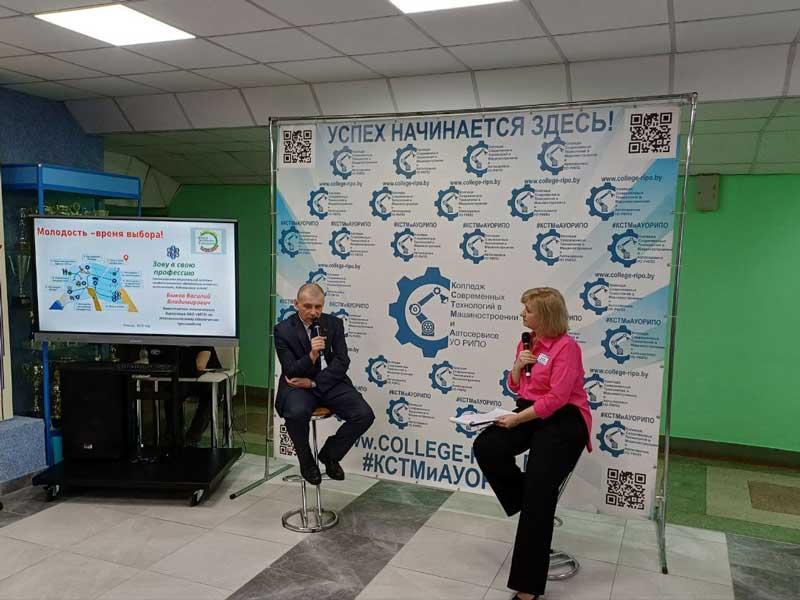 В филиале КСТМиА УО РИПО в рамках проекта "ШАГ", "Молодость –время выбора!Зову в свою профессию" прошла встреча с Быковым Василием заместителем технического директора ОАО "МТЗ" по технологическому обеспечению производств, выпускником филиала.