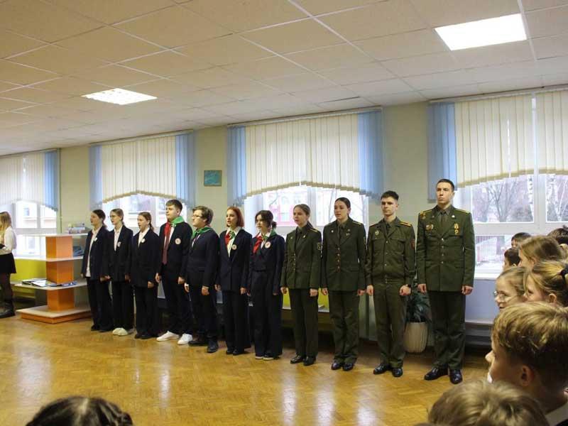 Курсанты военно-технического факультета в БНТУ и воспитанники подшефного военно-патриотического клуба "Вымпел" в торжественной обстановке провели ритуал принятия учащихся младших классов гимназии в ряды Белорусской республиканской пионерской организации и вручили им Октябрятские звездочки.