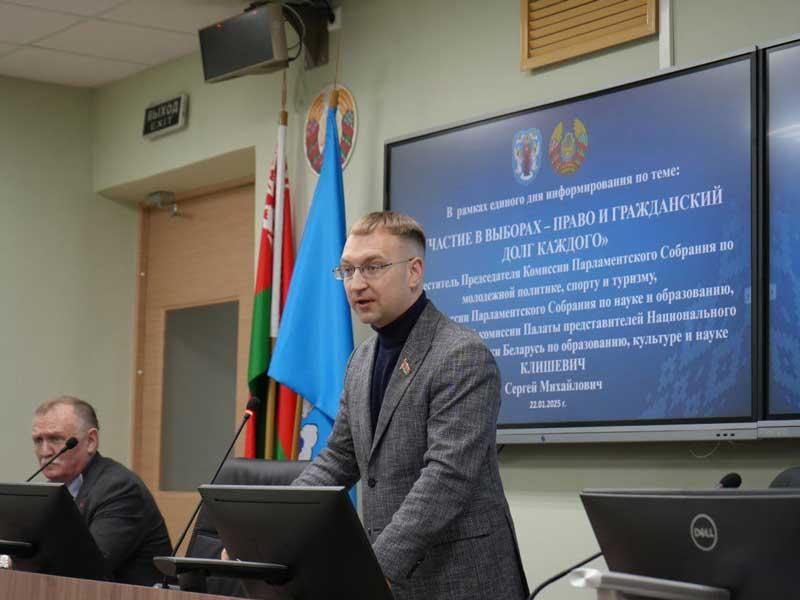 В Академии связи прошла встреча обучающихся и сотрудников с Сергеем Клишевичем, членом Постоянной комиссии по образованию, культуре и науке, членом в постоянно действующих делегациях в межпарламентских организациях, межпарламентских комиссиях, рабочих группах Национального собрания Республики Беларусь по сотрудничеству с парламентами иностранных государств, в рамках единого дня информирования на тему "Участие в выборах — право и гражданский долг каждого".