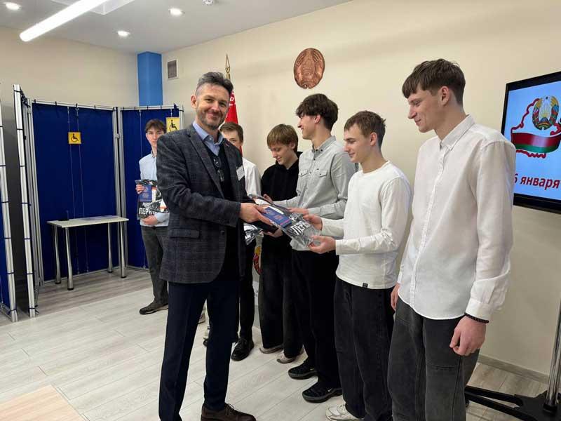 В рамках акции «Твой голос первый» впервые голосующих на избирательных участках встретили памятными подарками: издание «Символы суверенной Беларуси» и майки от Белорусского республиканского союза молодежи.