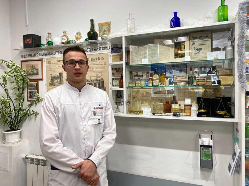 На полках можно найти аптечные препараты прошлого времени (такие как жидкий валидол с дозатором), книги, рецепты, аптечную посуду и приборы для приготовления лекарств.