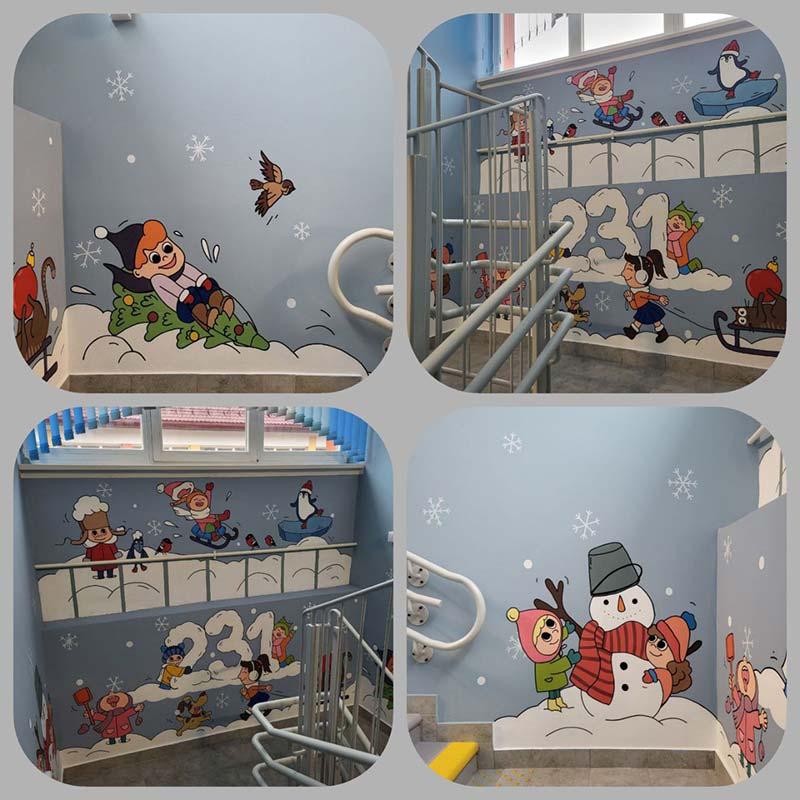 Эскизы получились красочными и привлекательными, и никого равнодушными не оставили. В них отражены игры и забавы детей в разные поры года. Росписи оживили интерьеры лестниц, стали эксклюзивом детского сада.