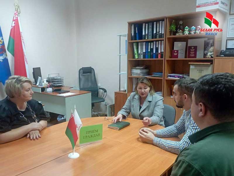 В общественной приемной Партизанской «Белой Руси» прием вела Вера Михайловна Грабовская-Дайнеко, адвокат Специализированной юридической консультации г.Минска «Технологии и право». За юридической помощью к ней обратились молодые специалисты промышленных предприятий района.