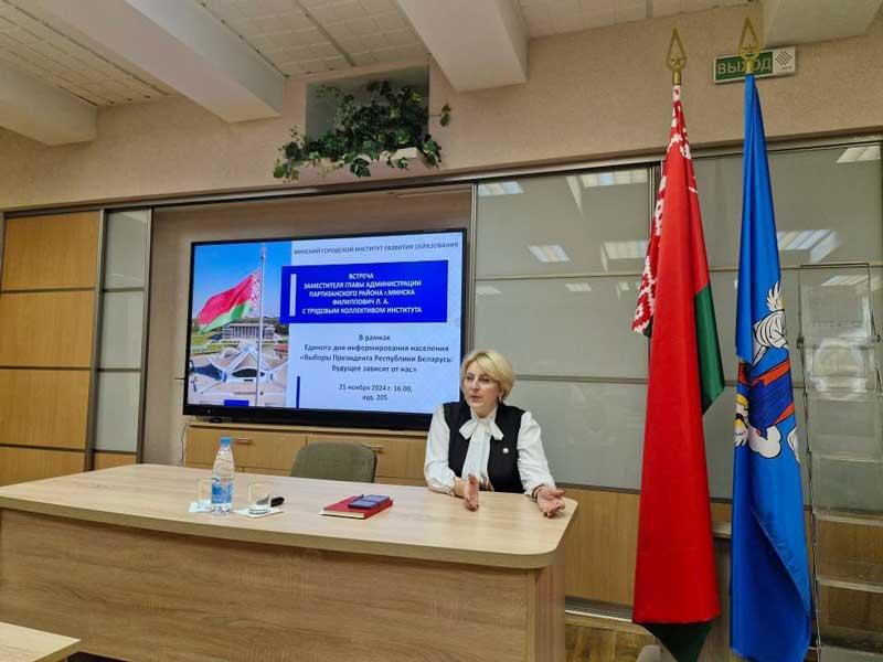 В рамках единого дня информирования по теме: "Выборы Президента Республики Беларусь: будущее зависит от нас" в ГУО "Минский городской институт развития образования" прошла встреча заместителя главы администрации Партизанского района Филиппович Людмилы Анатольевны с трудовым коллективом.