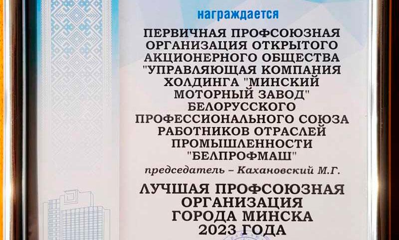 Плоды прошлогодней деятельности профсоюз ММЗ пожинает в текущем году: по итогам своей работы и по представлению столичных городских организаций отраслевых профсоюзов он признан лучшей профсоюзной организацией Минска 2023 года.