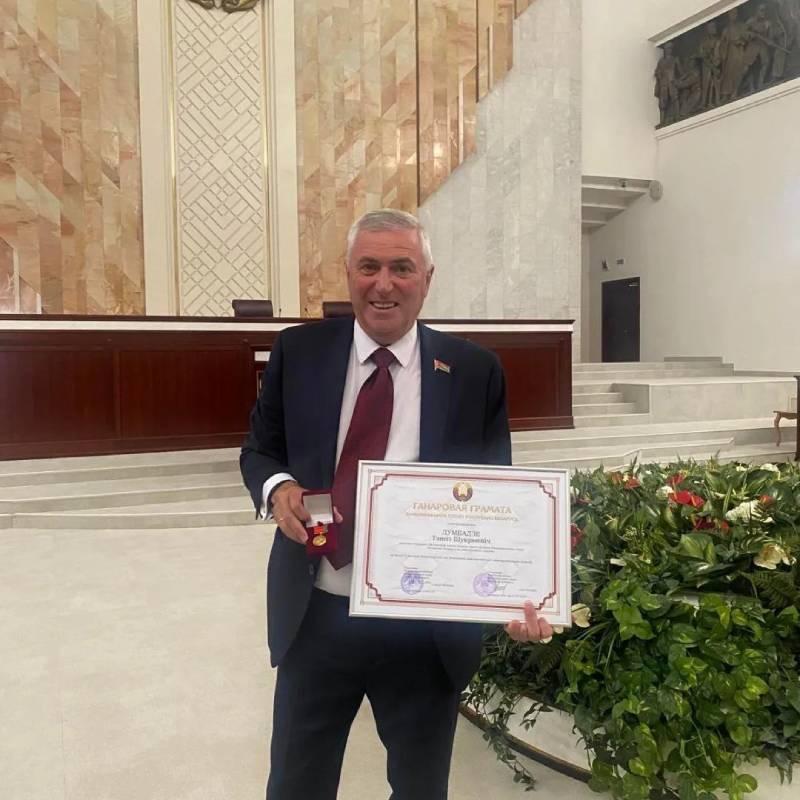 Почетной Грамотой Национального собрания Республики Беларусь за заслуги в развитии законадательстве и усиление межгосударственных и межпарламентских связей награждён депутат Тенгиз Думбадзе.