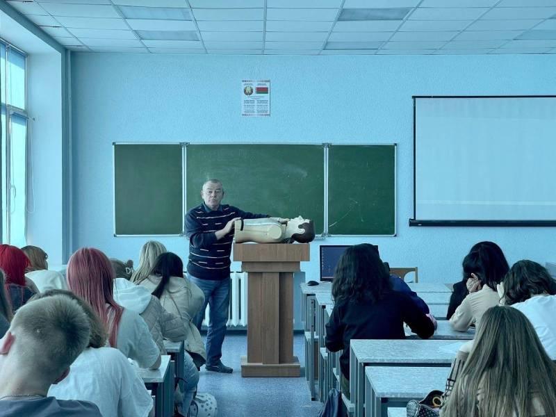 Калинов Александр Сергеевич рассказал студентам о количестве случаев происшествий в итоге неосторожного поведения на воде, озвучил правила безопасности на воде, а также показал тематические видеофильмы и продемонстрировал с помощью манекена приёмы оказания первой доврачебной помощи утопающему.
