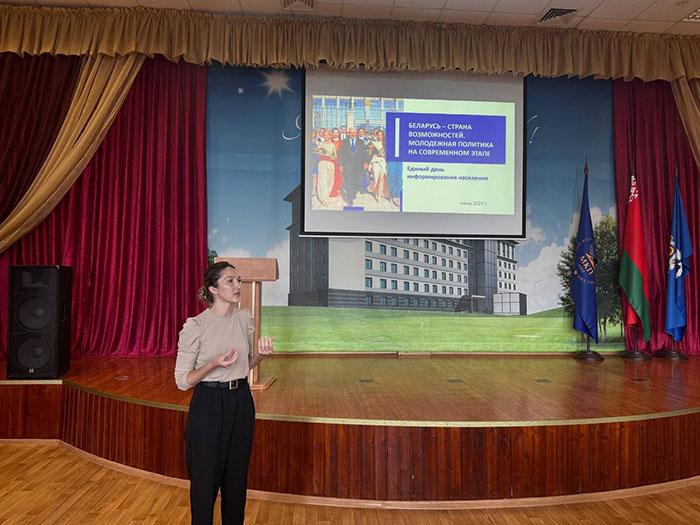 В УО "Минский государственный медицинский колледж" прошёл Единый день информирования по теме: «Беларусь - страна возможностей. Молодёжная политика на современном этапе». Спикером Единого дня информирования - Филиппович Людмила Анатольевна, заместитель главы администрации Партизанского района г. Минска.