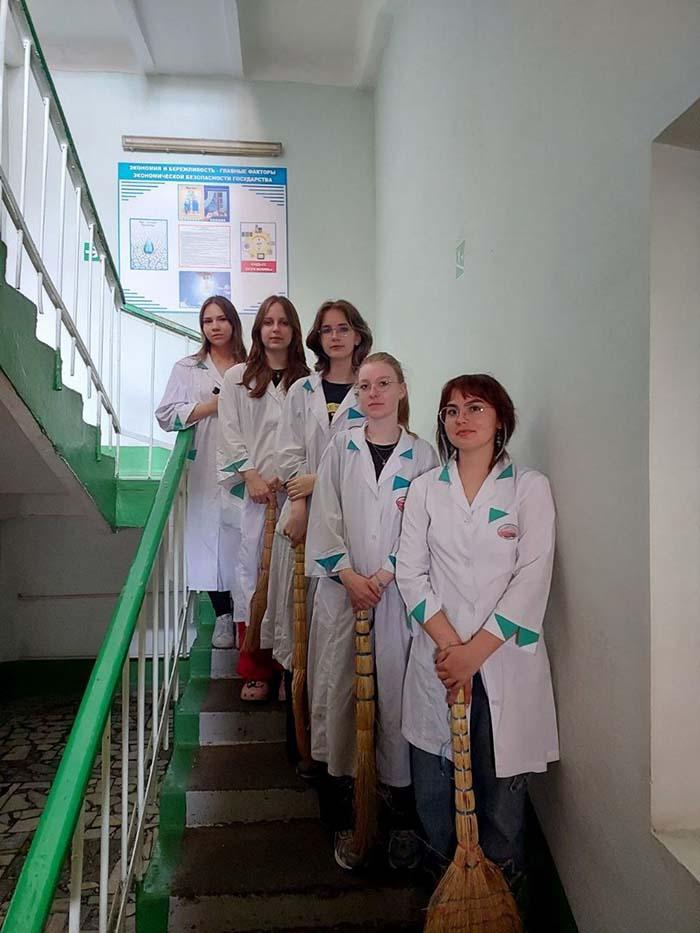 Студенческий отряд в сфере оказания услуг "Мастера чистоты" имени Героя Советского Союза Павла Яковлевича Головачёва из числа девушек Минского колледжа предпринимательства продолжает трудиться на ОАО "Минский комбинат хлебопродуктов".