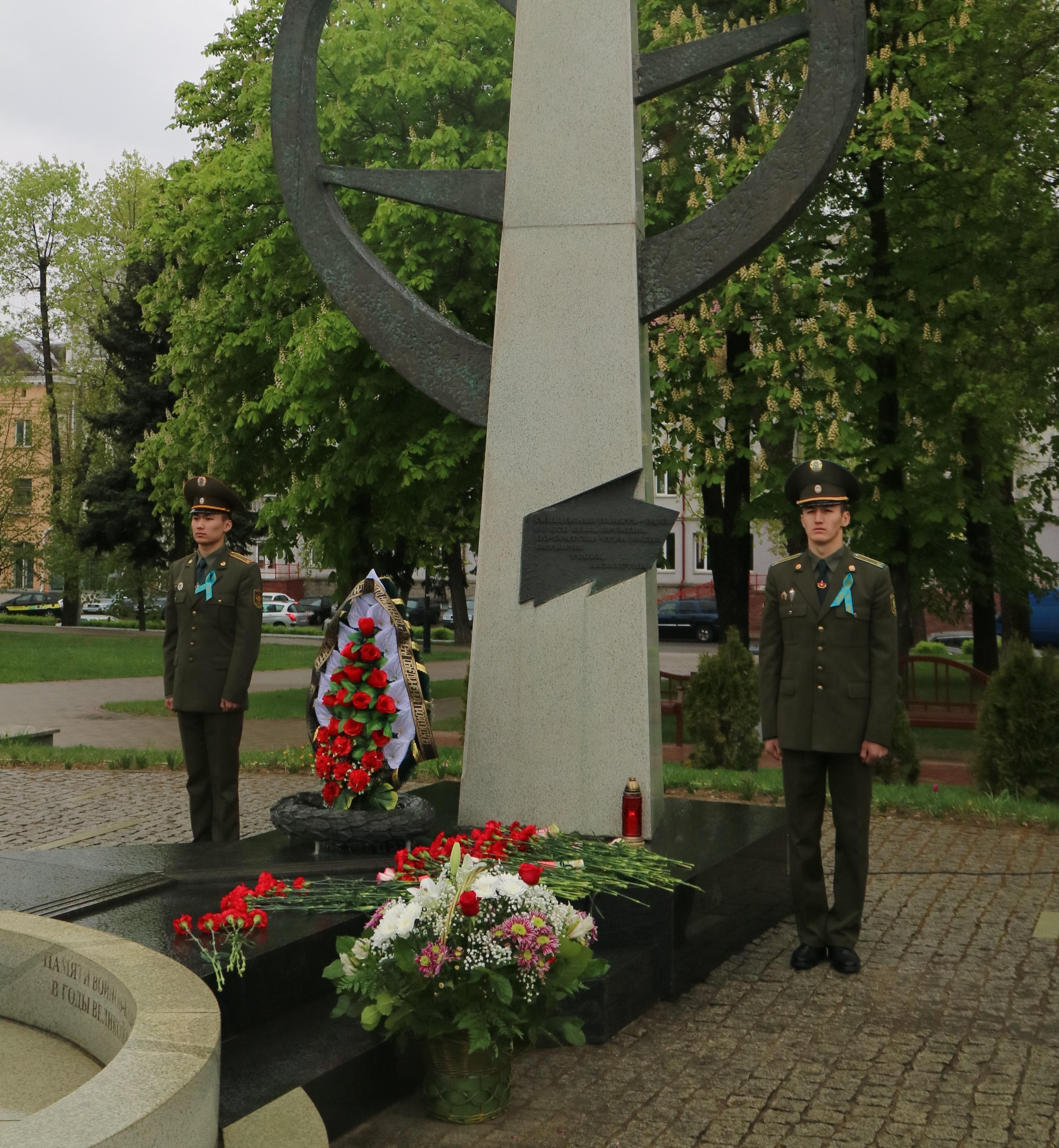 В сквере "Содружество" 3 мая в преддверии Дня Победы с участием официальных представителей Посольства Республики Казахстан в Республике Беларусь и актива казахской диаспоры Беларуси, руководства администрации Партизанского района г.Минска, представителей трудовых коллективов и общественных объединений состоялась церемония возложения цветов к памятному знаку воинам-казахстанцам, погибшим в годы Великой Отечественной войны на белорусской земле.