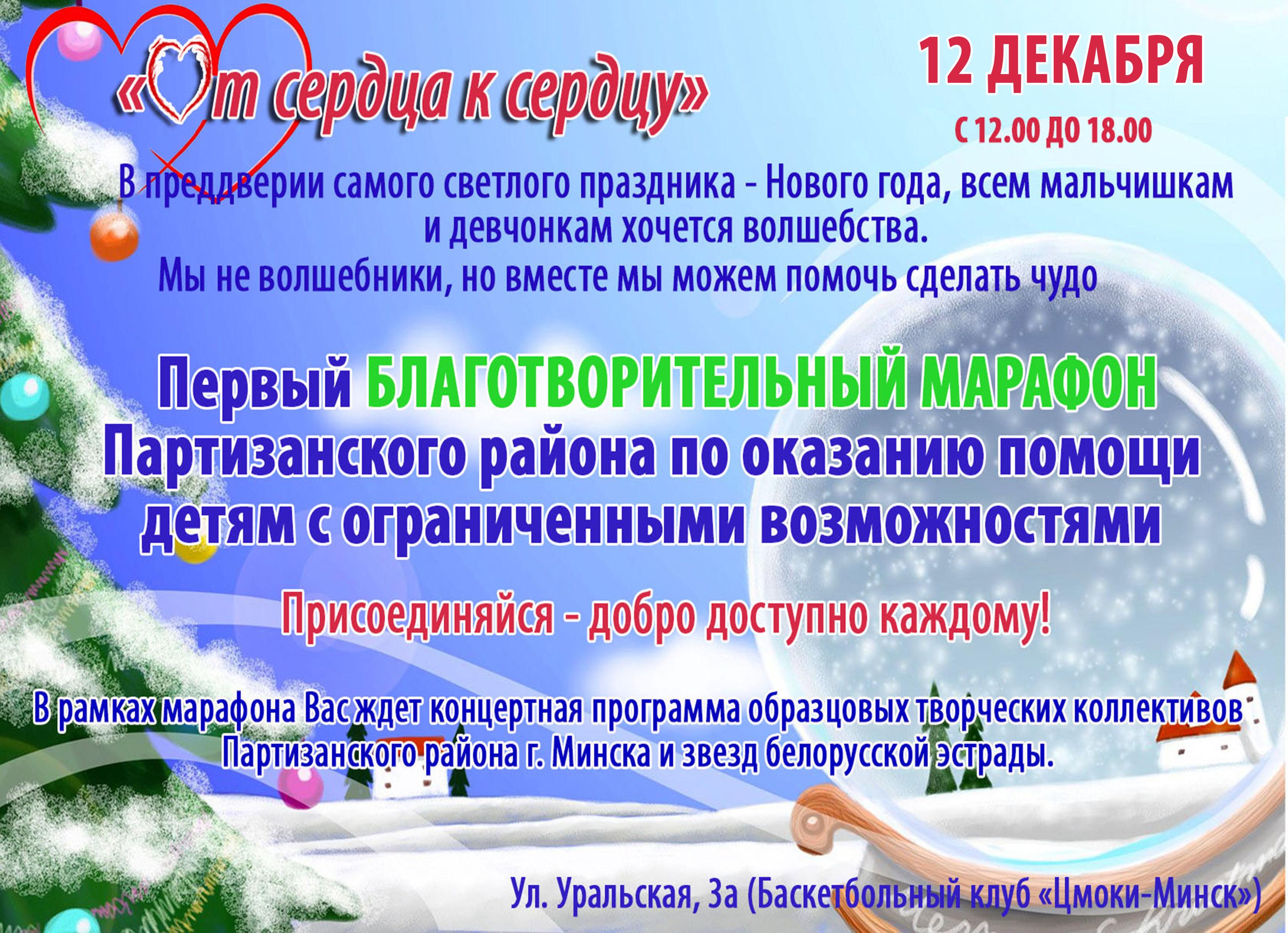 Сегодня в Партизанском районе столицы стартовал первый благотворительный марафон «От сердца к сердцу» по оказанию помощи детям с ограниченными возможностями. К 14.00 было собрано уже 28 тысяч белорусских рублей.