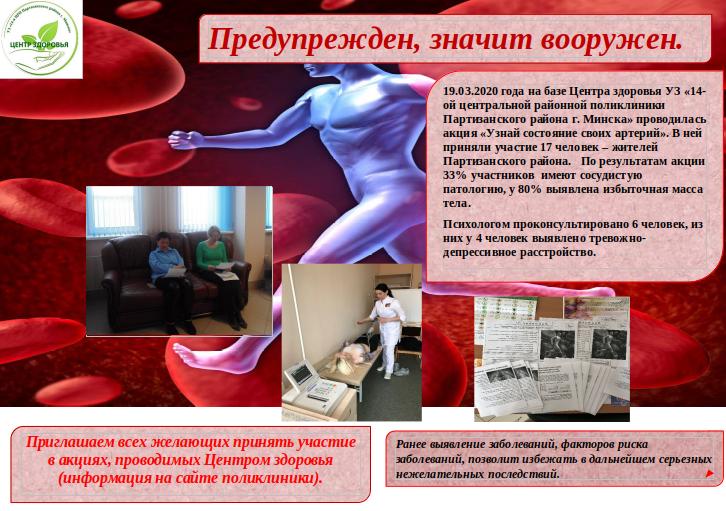 Так, 31 мая 2018 года Центром здоровья УЗ « 14-я центральная районная поликлиника Партизанского района г.Минска» на базе ОАО « Белкоммунмаш» была проведена акция « Вместе за здоровый образ жизни» , направленная на профилактику и раннее выявление неинфекционных заболеваний. В ходе проведения данного мероприятия проводилось анкетирование посетителей на выявление хронических неинфекционных заболеваний, факторов риска их развития, антропометрия ( измерение роста, веса, индекса массы тела), измерение артериального давления, забор крови для общего анализа ,а также для определения холестерина и глюкозы крови, проведение электрокардиографии и спирометрии, для женщин –осмотр молочных желез. Со всеми участниками акции проводилась беседа психолога по выявлению общего эмоционального состояния и выявлению психосоматических компонентов.