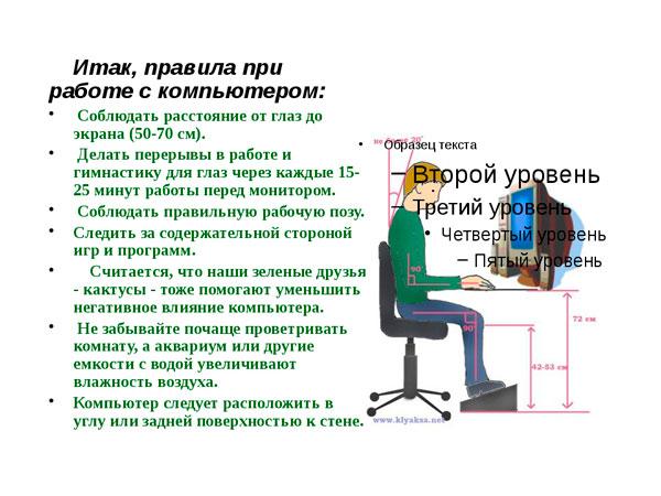 — Важное значение имеет направление взгляда. Расположите монитор таким образом, чтобы он был на 10 см выше уровня глаз и находился примерно на расстоянии вытянутой руки. Позаботьтесь о том, чтобы на экране монитора не отражались потолочные светильники или солнечный свет из окна. При работе на клавиатуре нужно обеспечить рукам минимальный изгиб запястья. Сидеть нужно прямо, а стул для работы за компьютером выбрать такой, который будет хорошо фиксировать нижнюю часть спины.