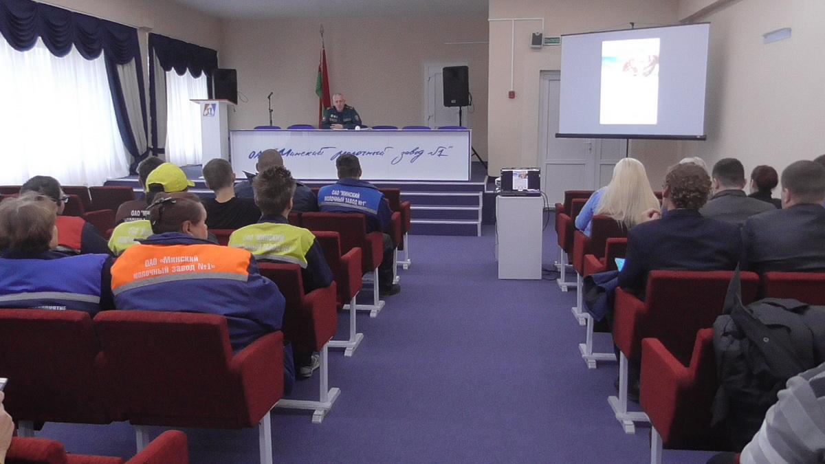 Начальник Партизанского РОЧС Сергей Шейпак встретился с работниками ОАО «Минский молочный завод № 1», который на протяжении многих лет производит молочную продукцию из натурального молока и остается лидером молочной отрасли Республики Беларусь. Свое выступление начальник Партизанского РОЧС начал с доведения оперативной обстановки в республике и Минске за прошлый год, провел сравнительный анализ по количеству пожаров и гибели людей на них. Особое внимание Сергей Шейпак обратил на происшествия и чрезвычайные ситуации, которые чаще происходят в осенний и зимний период. Это пожары в частном секторе по причине неправильной эксплуатации печного отопления, пожары в жилом фонде по причине нарушения правил эксплуатации электросетей и электрооборудования; были приведены конкретные примеры пожаров. Далее начальник отдела заострил внимание присутствующих на такой проблеме, как гибель и травматизм детей на пожарах, обратил особое внимание о недопустимости оставления детей без присмотра. Рассказал он о необходимости установки автономных пожарных извещателей (АПИ) в домовладениях и квартирах граждан. Подчеркнул, что установка АПИ — это оправданная необходимость каждого сознательного гражданина, ведь эти устройства в случае возникновения пожара помогают обнаружить возгорание на ранней стадии его развития и оперативно предпринять правильные действия. Были приведены конкретные примеры, когда автономные пожарные извещатели спасли человеческую жизнь и показан принцип работы АПИ.