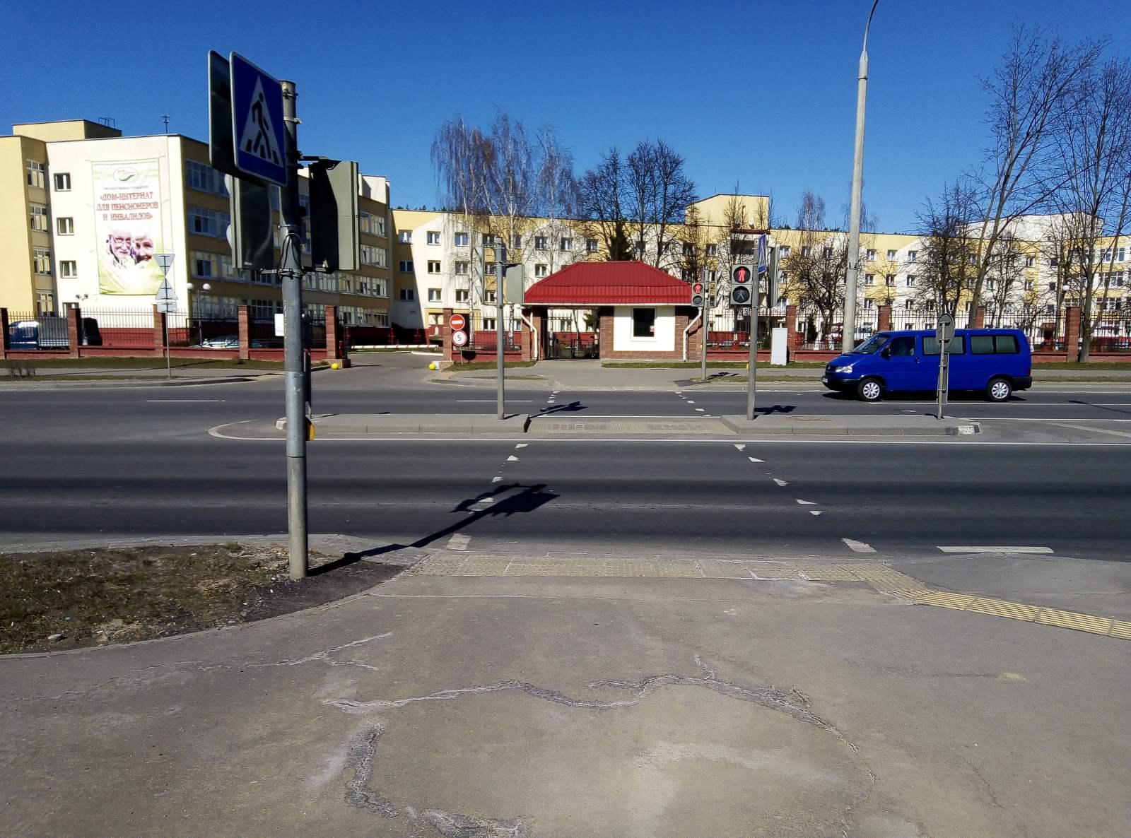Регулируемый пешеходный переход на улице Ваупшасова в Минске оборудовали звуковой сигнализацией и сделали удобный подход к сенсорной кнопке для вызова зеленого сигнала светофора.