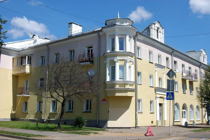 Вот что в 1950 году писал в своей книге «Минск» известный архитектор Михаил Осмоловский: «В этом районе завершается комплексное строительство и благоустройство 12 кварталов жилых домов со школами, детскими учреждениями, магазинами, гостиницей, поликлиникой и всеми видами коммунального обслуживания населения. В некоторых домах используется имитация бруса. Деревянные панели, имитирующие профилированный брус, поддерживают комфортную температуру и влажность в помещении, обеспечивают высокий уровень звукоизоляции.