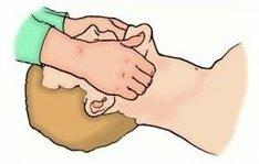 Начать выполнение искусственного дыхания в сочетании с непрямым массажем сердца (кроме пострадавших, у которых имеются травмы грудной клетки): каждые два вдоха чередовать с 30-ю ритмичными надавливаниями на грудину. Непрямой массаж сердца делают основаниями ладоней обеих выпрямленных рук, нажимая на грудину на уровне границы средней и нижней ее трети на глубину 4-5 см. У детей до года непрямой массаж сердца выполняется большими пальцами обеих рук с глубиной нажатия 2-3 см.