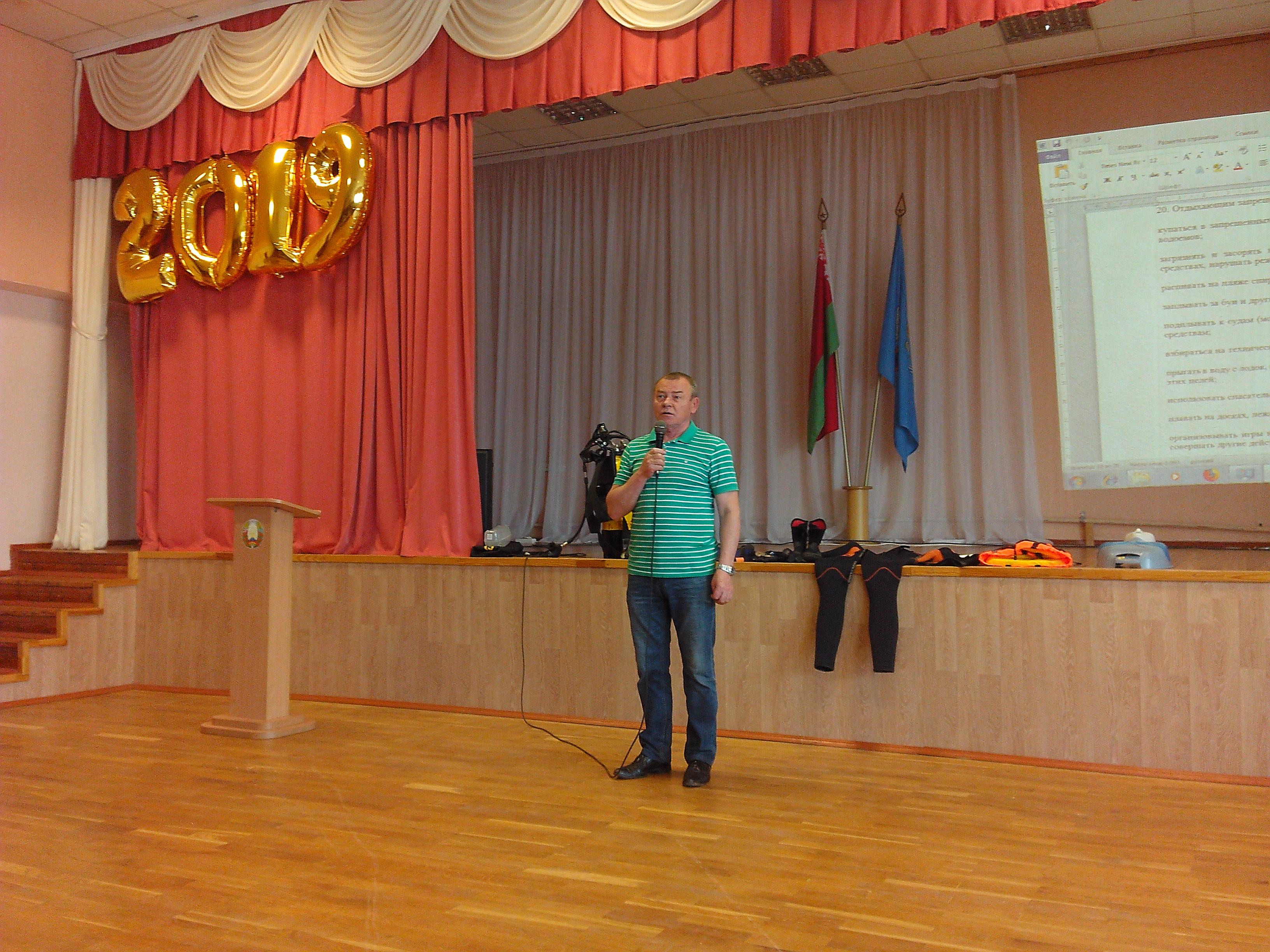 22.05.2019 учащиеся средней школы №10 и гимназия №7 были ознакомлены с правилами поведения на воде в предстоящих летних каникулах. В средней школы №10 учащимися 7-9 классов (120 чел.) была проведена беседа председателем РО ОСВОД Партизанского района Калиновым А.С, о мерах безопасности на воде. Водолаз-спасатель спасательной станцией Вяча Вашкевич А.Ю. рассказал учащимся о правилах поведения на воде и оказания первой помощи утопающему. В 7 гимназии учащиеся 6-7 классов были ознакомлены с правилами проведения на воде летом и недопущения нарушения мер безопасности на водах.