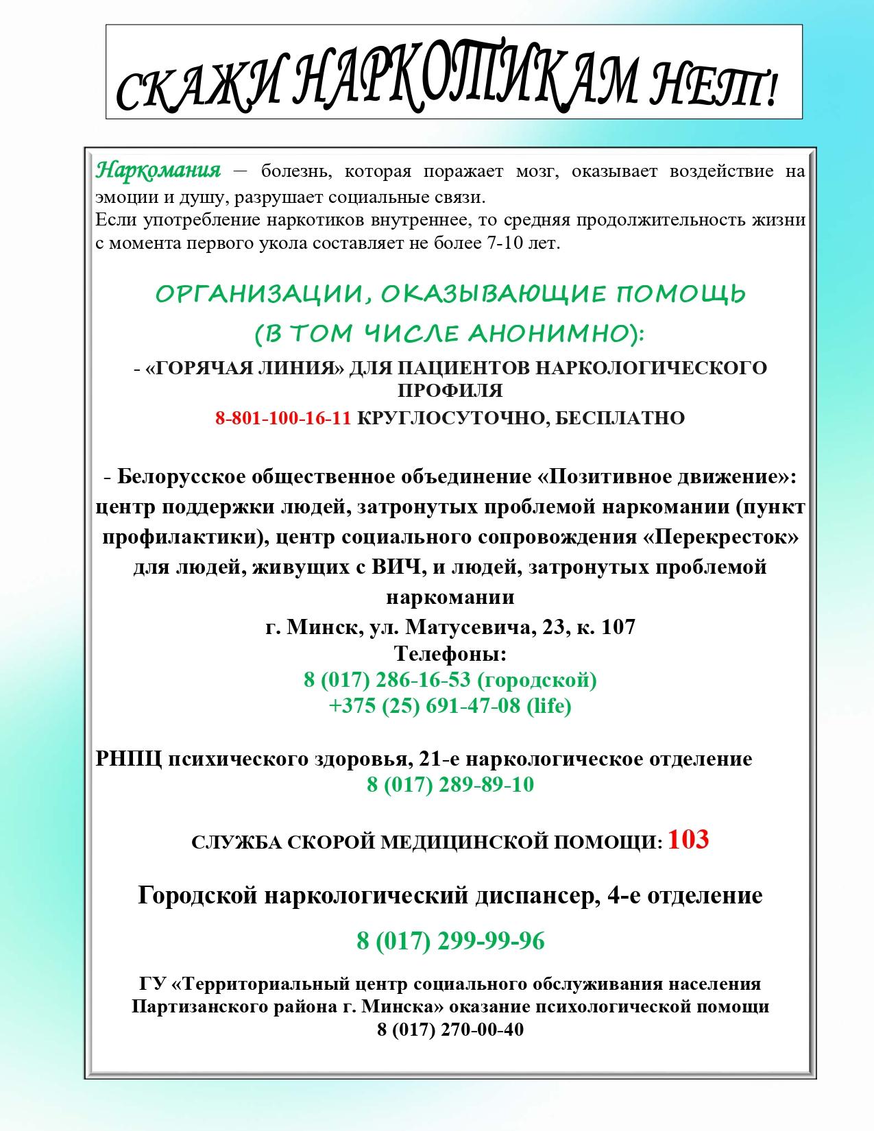 Кабинеты врача для анонимного лечения наркомании тел. (017) 245-14-01, 345-71-57