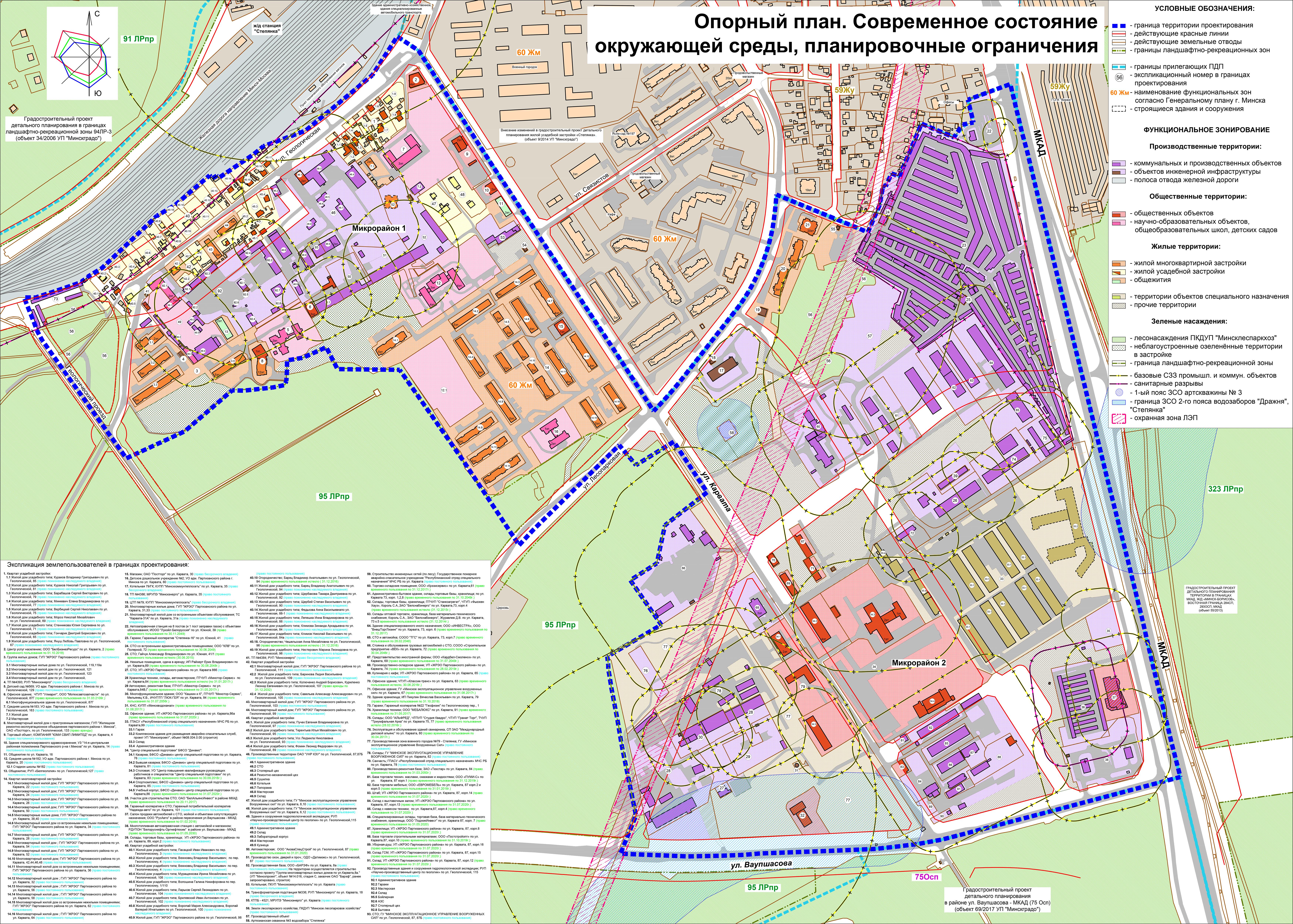 Задачи проекта: разработка информационного и правового документа для регулирования градостроительной деятельности на проектируемой территории в части установления требований к ее планировочной организации, функциональному использованию и характеру застройки в соответствии с Генеральным планом г. Минска до 2030 года.