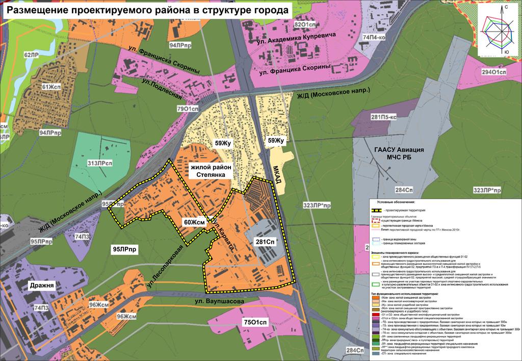 Проектируемая территория, площадью 142 га, расположена в Партизанском административном районе города Минска, в состав которой входят: зона жилой смешанной многоквартирной застройки (60 Жсм), зона специализированного назначения (281 Сп), зона озелененных ландшафтно-рекреационных территорий (95 ЛРпр).